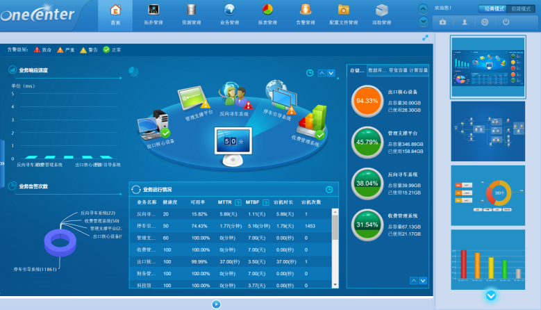 提供第三方标准数据接口,提供开放的API接口,支持二次开发。OneCenter可以接收包括云计算平台在内的第三方系统的数据或者发送数据给第三方系统,进行一体化整合,实现IT资源的集中统一管理;可以结合短信平台、邮件系统、桌面客户端等,进行故障、工单等信息的通知发送;提供数据整合、接口整合、页面整合等方式,可以集成第三方系统的告警、监控、流程、资产、动环、3D等数据,也可以集成页面,并通过接口调用完成告警集成、工单自动生成、3D机房集成、动环数据集成、云平台监控数据集成、云平台配置等操作集成,有效复用已有系统,无需重复投资;提供与华为云平台、阿里云平台接口集成的方式,统一汇总云平台监控数据、告警数据,在OneCenter一体化智能运维管理平台中进行监控信息、告警信息的呈现,并进行业务关联分析、告警关联分析。